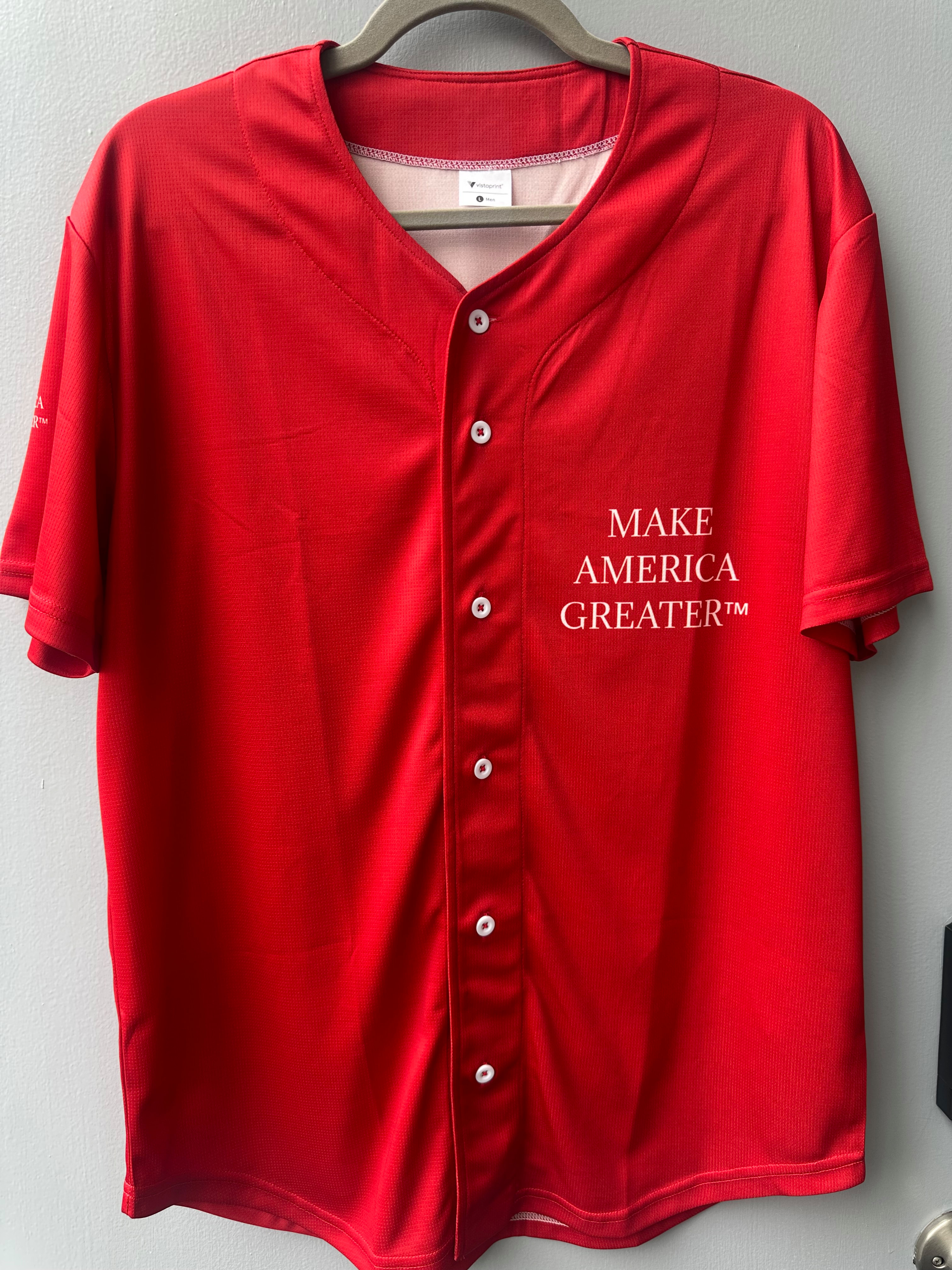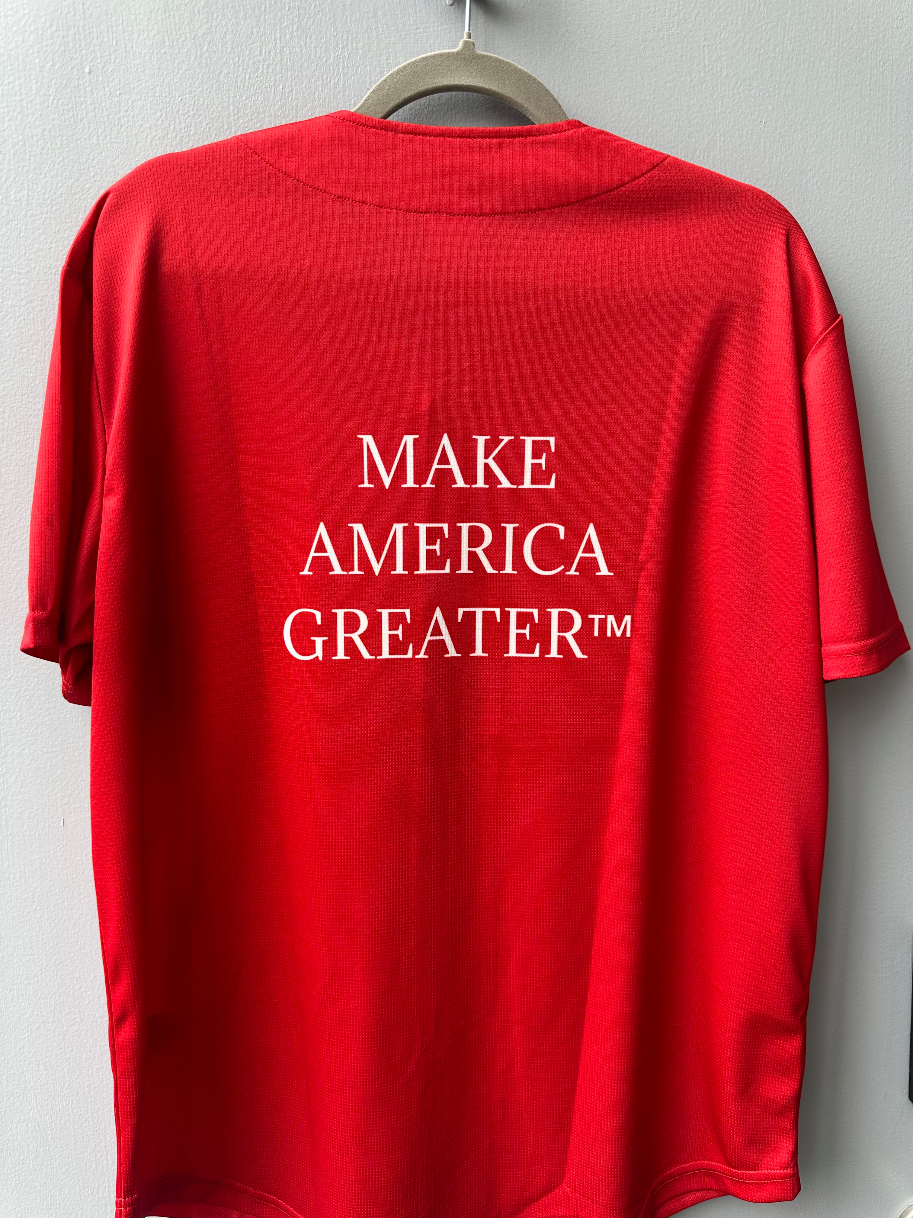 This fashionable performance jersey will be perfect for warmer months. Show off your patriotic spirit by proudly displaying the Make America Greater™ slogan.